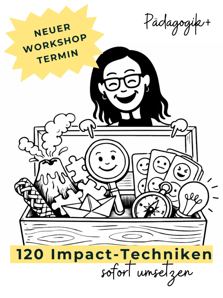 Freue dich auf 120 praxiserprobte Impact-Techniken, sofort einsetzbar in Lerngesprächen und Unterricht. Ich freue mich auf dich. Wir sehen uns im Workshop.